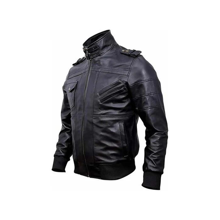 Crafted with 100% genuine leather, the Black Guerrilla Bomber Jacket is a bold addition to your closet. Its removable hood, rib-knitted cuffs, belted collar, chest pocket and shoulder snaps are all