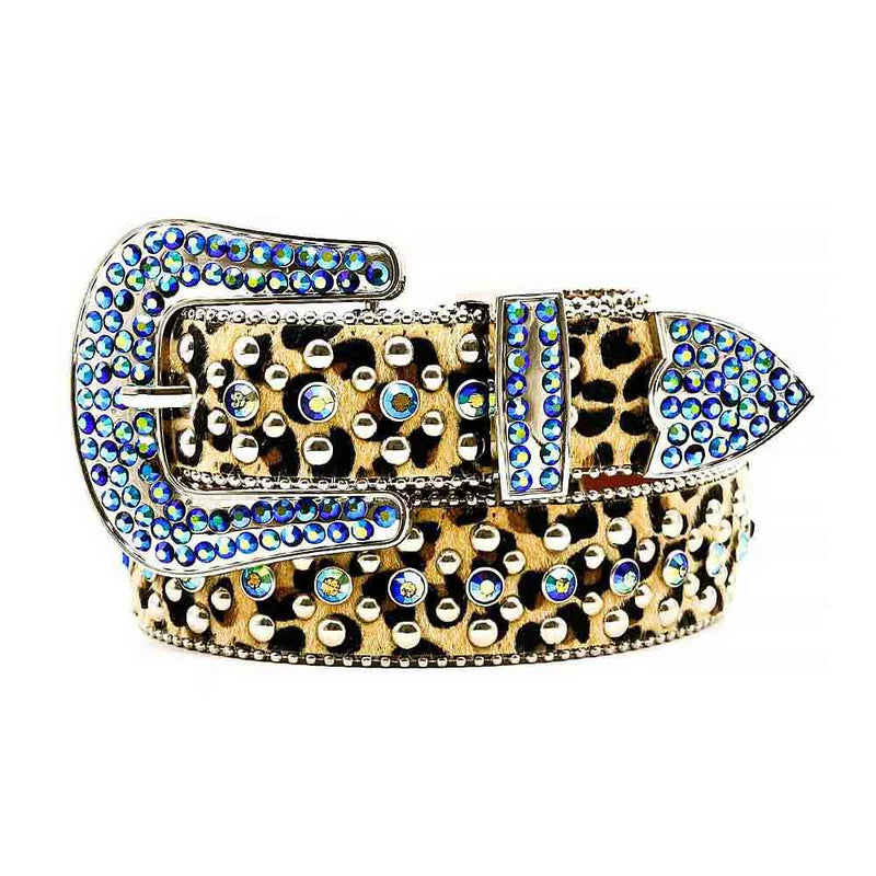 The belt features a bold tiger print strap that is sure to catch the eye, and is embellished with blue shiny rhinestones for a touch of glamour. The silver buckle is also adorned with blue diamonds, adding an extra element of elegance to this already stunning piece.