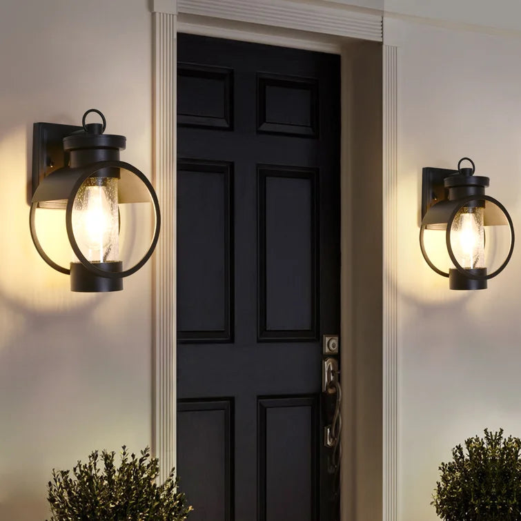 This set of two outdoor light fixtures are a modern take on a classic, lantern style. They are made from water-, rust, and UV- resistant wrought iron in a matte black hue and feature square backplates and round, open frames that ensconce the filament bulbs (sold separately) in bubble glass shades. Rings on the top evoke an old-world look, when lanterns were carried to light the way. We love the dawn to dusk feature on these dimmable lamps and the fact that they are reverse mountable, depending on your preference. This product comes with a one year manufacturer’s warranty.