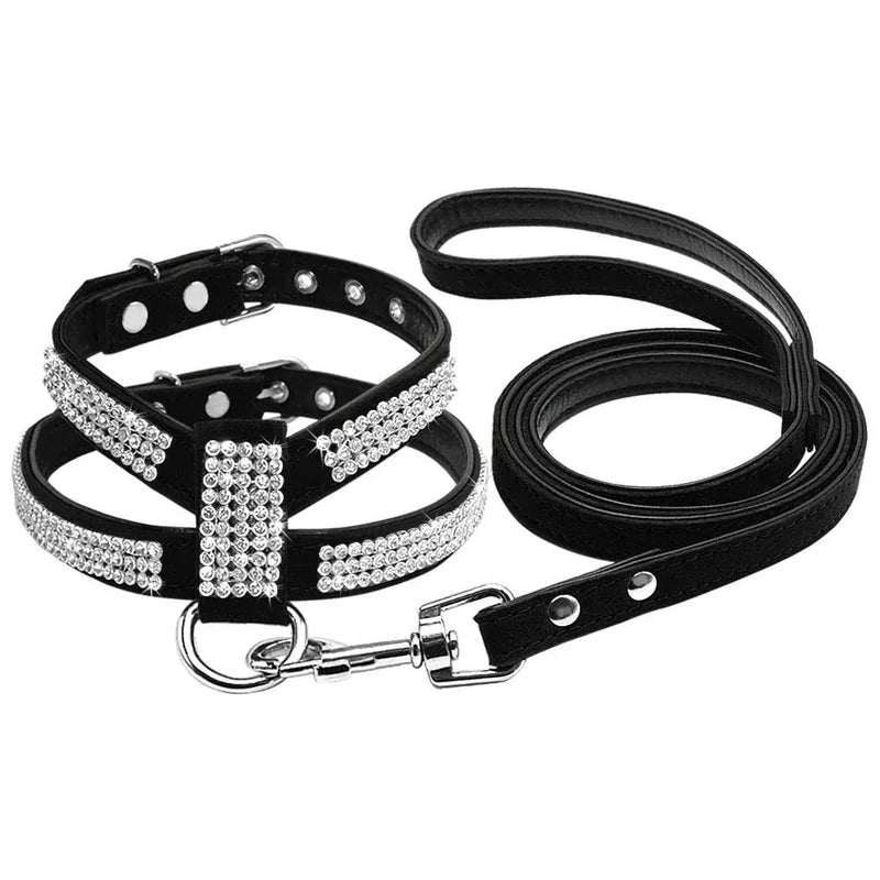 Add life to your pet's style with our Rhinestone Leather Harness & Leash Set. Designed for both flair and function, it's the perfect combo of fashion and practicality.